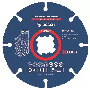 Multi-wheel that uses sharp carbide grits on its rim to cut multiple materials effectively. Suitable for angle grinders. The grits are joined to a steel body for an extra strong bond. Cuts wood, embedded screws and nails, plastic pipes and makes accurate cutouts in tough panels such as laminates and drywall. Maintains a constant speed and depth with Carbide Technology for durability. Click it on with X-LOCK for fast accessory changing.